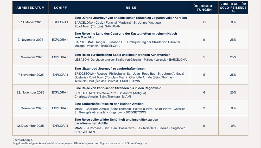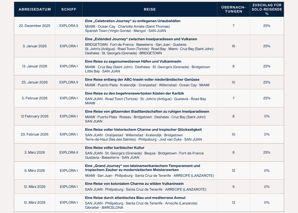 EXPLORA Journeys viele Single - Reisen bis 2027....